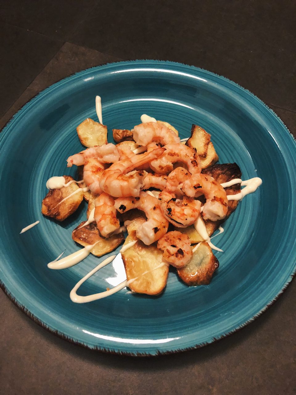 Una volta cotte sia mazzancolle che patate impiantiamo.