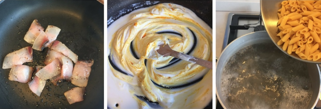 Scolate la pasta, ripassatela un minuto in padella con panna, zafferano,guanciale, pepe e sale.