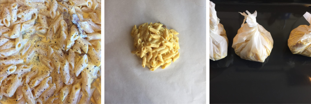 Su ogni foglio di carta forno versate una porzione di pasta.