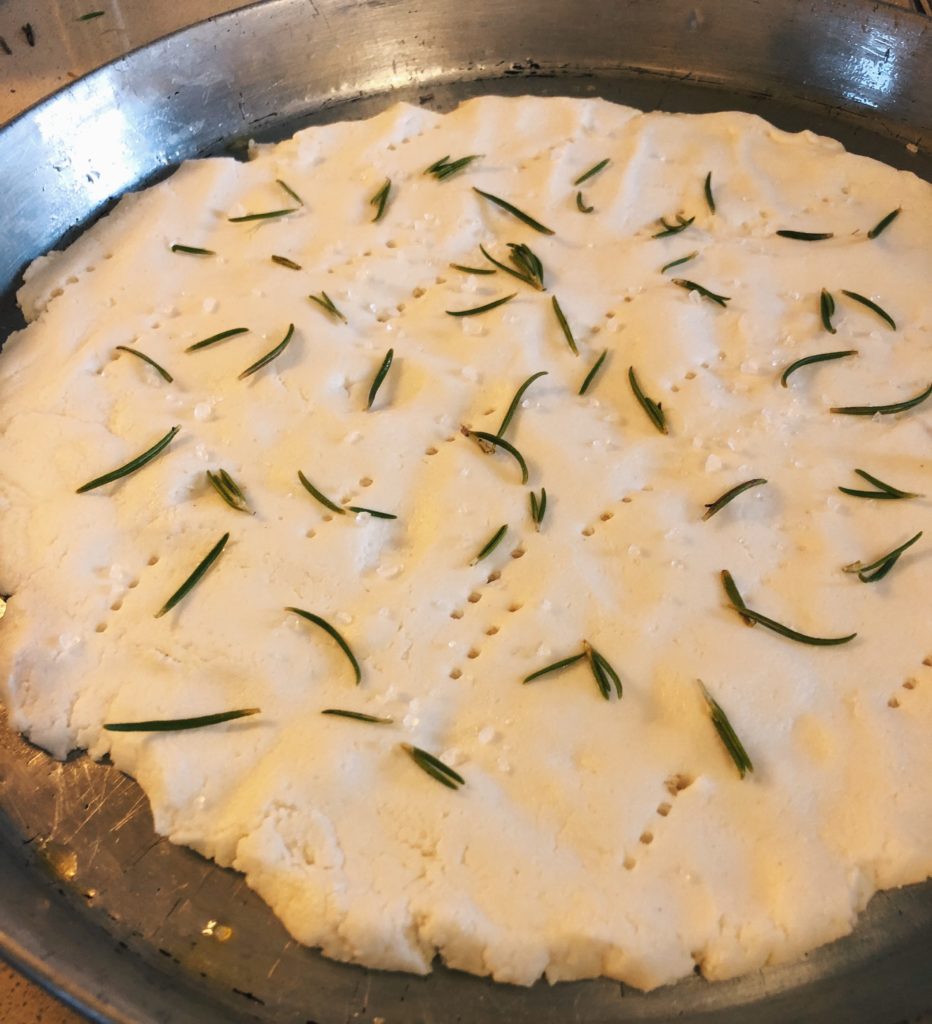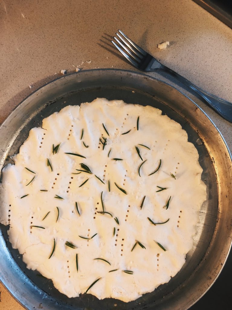 Per la pizza bianca praticate dei fori con la forchetta, salate con del sale grosso e cospargete con le foglie del rosmarino precedentemente lavate ed asciugate.