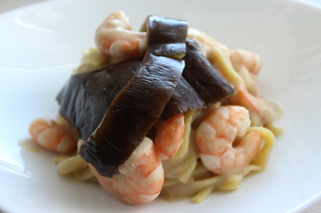 Cuocete le tagliatelle per 5 minuti, scolatele e versatele nella padella con le mazzancolle, la crema di melanzane e aggiungete il peperoncino a piacere.