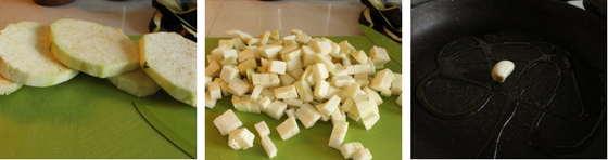 Partite sciacquando velocemente la melanzana e tagliandola a fette spesse ed eliminando la buccia viola intorno. Lasciatela da parte perché vi servirà per impiantare. Ora ricavate dalle fette dei piccoli dadi. Ungete una padella con dell’olio e fate rosolare uno spicchio d’aglio.