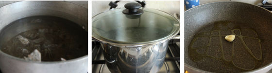 Mettete a bollire l’acqua per la pasta e rosolate uno spicchio d’aglio.