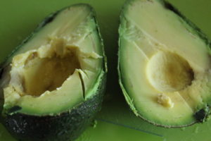 Nel frattempo tagliate a metà l’avocado, apritelo ed eliminate il nocciolo.
